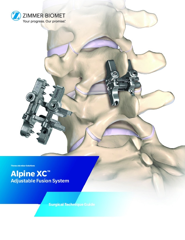 The Alpine XC is an expandable Adjustable interspinous fixation clamp. The Alpine XC was originally marketed under Zimmer-Biomet, now under ZimVie and Highridge Medical. The device offers an alternative to pedicle screw fixation and allows a less invasive interspinous fixation options for fusion.