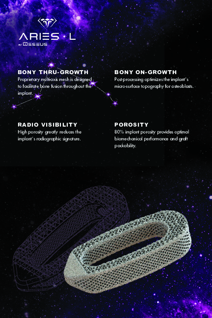 The ARIES-L Interbody Fusion Device by Osseus is a 3D printed porous titanium spacer for use in the direct lateral retroperitoneal LLIF approach. If features a tapered nose and an open architecture for bony ingrowth and reduction of imaing artifact.