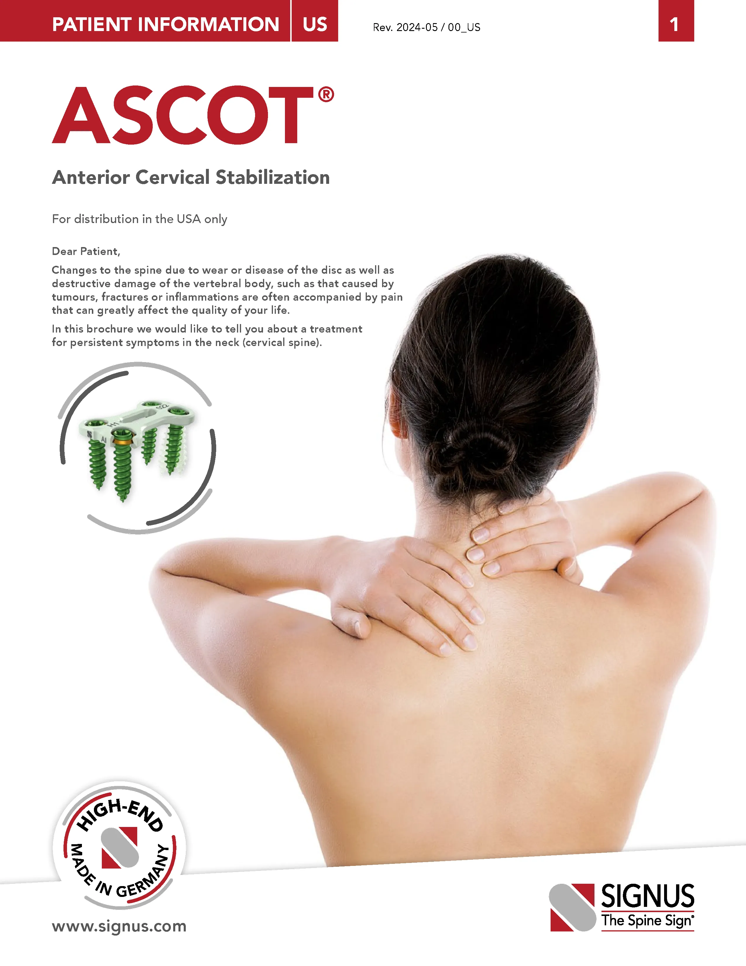 The ASCOT anterior cervical plate by Signus is made of biocompatible titanium alloy and designed for ventral stabilization of the cervical spine. The plate is low profile at 1.8 mm thick, has a pre-lordosed semi-rigid design with large angle variability, and has an efficient single step integrated locking mechanism. Screws are available in self-drilling, self-tapping, and variable- and fixed-angle options. Additionally, graft screws and connector screws can be inserted through the plate to attach to bone graft or interbody/VBR implant to ensure a secure construct.