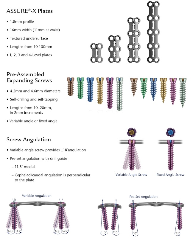 The ASSURE -X Anterior Cervical Plating System by Globus Medical is an anterior cervical plate for use in the ACDF procedure as supplemental fixation. Comes as single level up to 4 level plate. Similar to the ASSURE plate but with high degree angulation of the cranial and caudal screws up to 18 degrees.