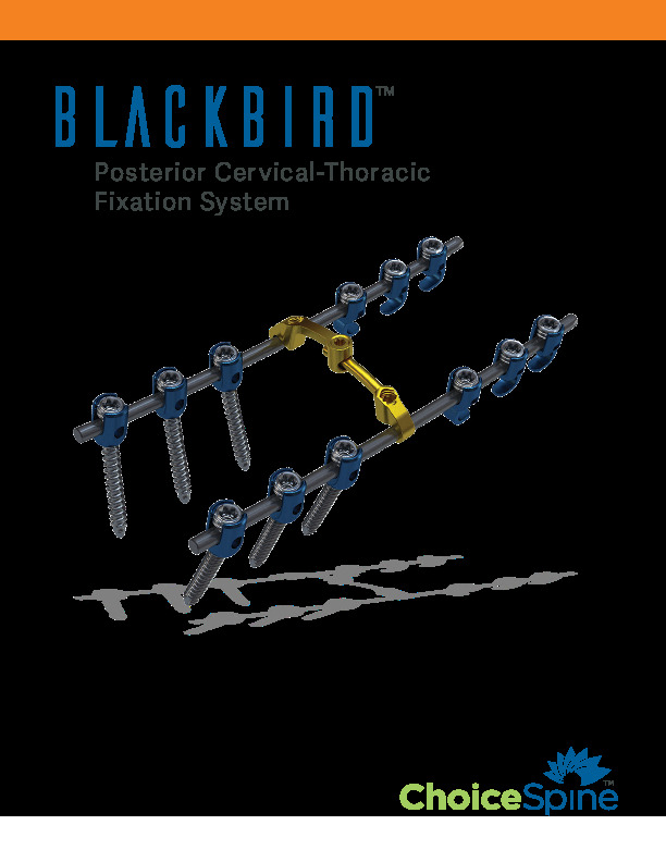 The BLACKBIRD Posterior cervical-thoracic fixation system by Choice Spine is a comprehensive system for fusions in the cervical and upper (T3) thoracic spine. It features a complete set of high-angulation polyaxials heads in both full-thread and partial thread options.