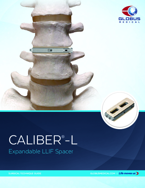 The CALIBER -L is a lateral lumbar expandable interbody spacer by Globus Medical. The spacer is made of a titanium center and expansion mechanism with PEEK endplates to help facilitate imaging. Eat cage has up to 5mm overall expansion.