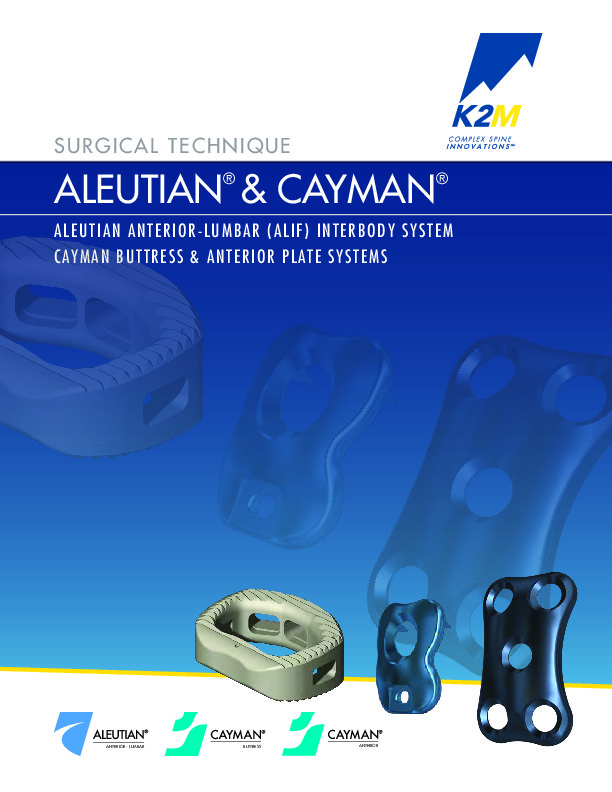 The Cayman Anterior lumbar plating system by K2M Stryker is a single and 2 level titanium plate for use in the ALIF procedure. Also comes as a buttress plate.