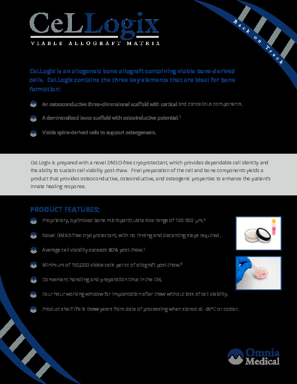 The CeLLogix by Omnia Medical is a Viable Cellular allograft bone scaffolding that comes as a frozen DMSO-freee cryoprotectant. After thawing, provides 80% viable cells and minimum of 150k cells per cc. Product is shelf stable frozen for up to two year