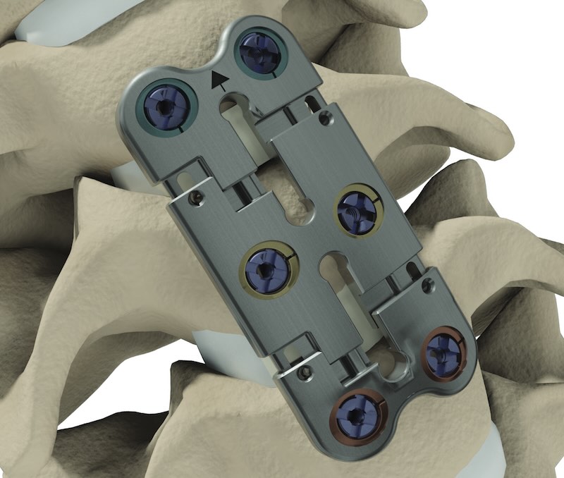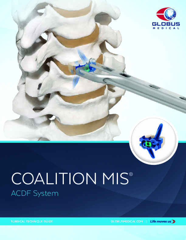 The COALITION MIS is an integrated PEEK cage and titanium plate that utilizes an integrated anchor fixation system allowing implantation of the spacer through smaller corridors. The spacer can be used with the MIS anchor or traditional screw fixation.