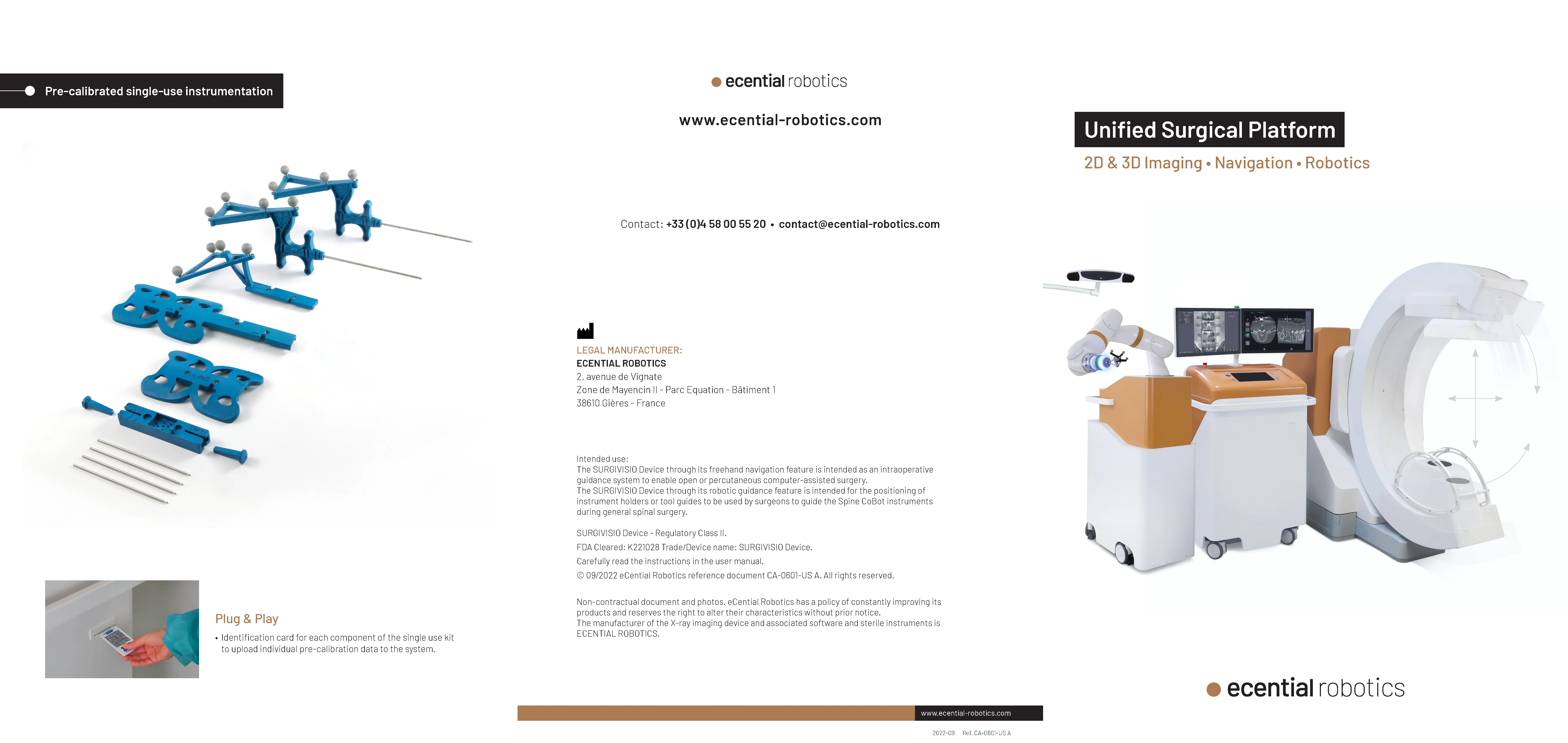 The CoBot eCential Robotics platform is an open platform agnostic to vendor implant that features a mobile base robotic arm intended to enable the surgeon quickly execute the preplanned surgical plan efficiently. eCential Robotics is based in Grenoble, France.