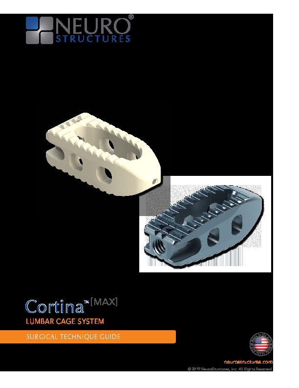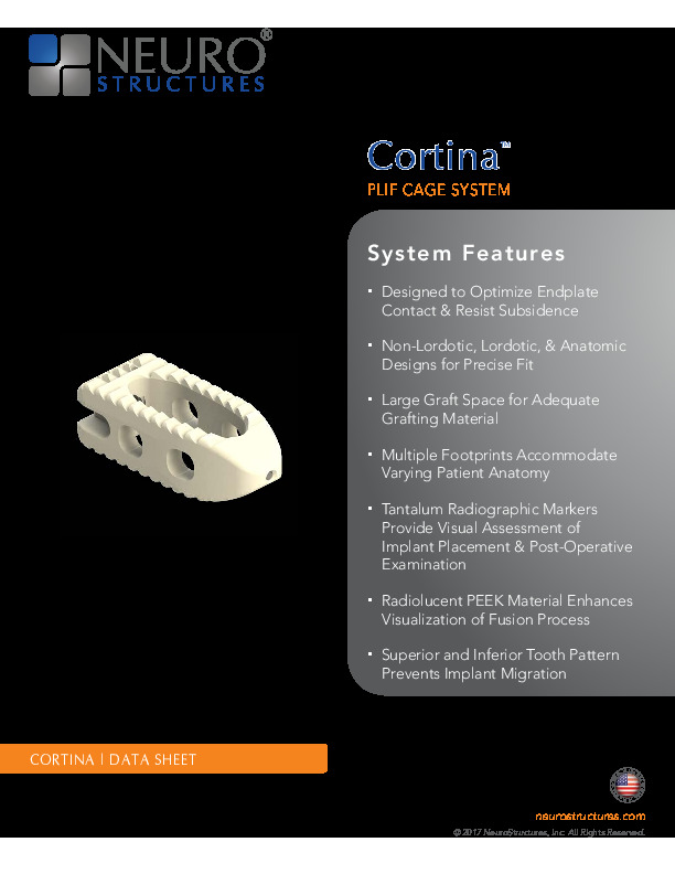 The Cortina interbody device by NeuroStructures/NuGen is available in radiolucent PEEK or porous titanium and intended for posterior lumbar approach. Superior and inferior surfaces are designed to optimize endplate contact to resist subsidence, and the tooth pattern created to prevent implant migration. The implants come in multiple lordotic and non-lordotic footprints to accommodate varying patient anatomy, with large graft space and trabecular structure to promote multi-axial new bone ingrowth.