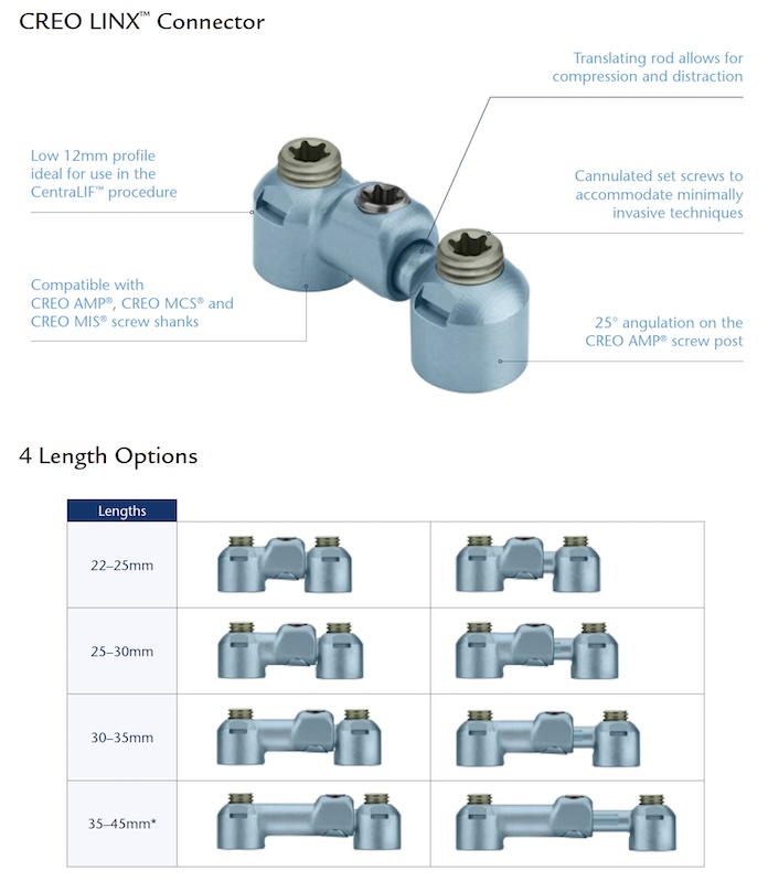 The CREO LINX is a single level modular pedicle screw post connector for use with the CREO AMP system. It is an implant that locks to the modular post that replaces the rod and caps used in traditional fixation methods. The system translates to accomodate several mm of translation.