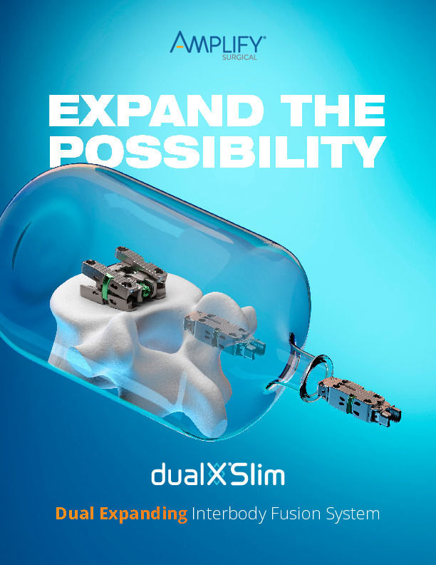 The dualX LIF by Amplify Surgical is a Bi-Directional expandable interbody pacer for the lumbar spine for use in the TLIF approach. It I all titanium construction and inserts at 12mm width and expands up to 21mm for an expansion of 9mm. Heigh expansion up to 3mm. Available as fixed lordosis options
