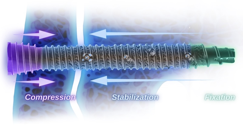 The DYNAMIS Sacro-iliac Joint fixation system by Promethean Restorative is a 3D printed titanium implant system for use in the MIS Lateral fixation of the SI joint. It is composed of 3D printed titanium with DYNABridge 3D lattice structrure which allows for bony ingrowth along the screw. The tip is a self-drilling, self-tapping screw. The thread design allows for compression at the head. The screw is cannulated for use with guide wire and the system featrues a Ghost Guide that allows optimal spacing between the screws.