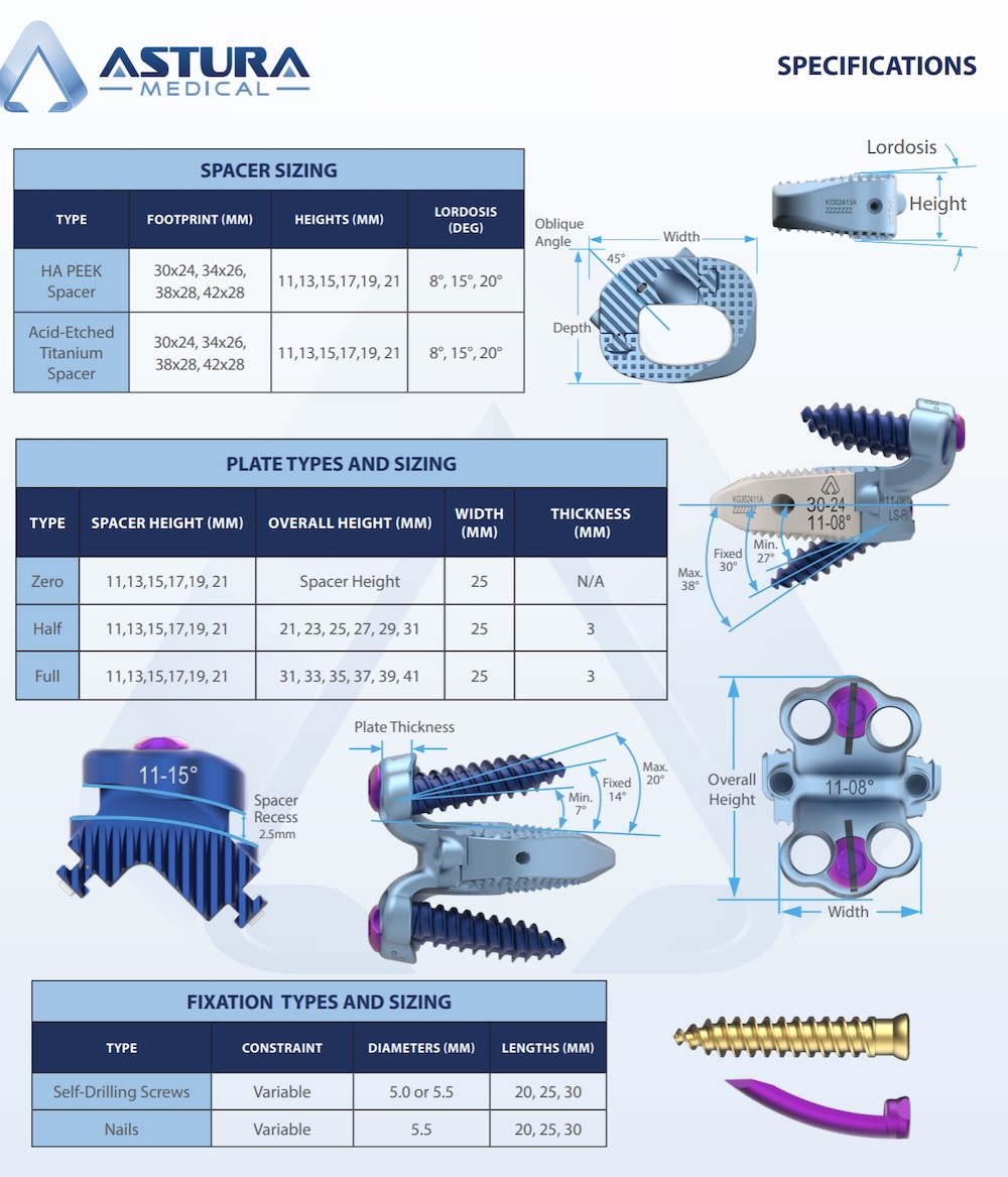 El Capitan Oblique ALIF standalone spacer by Astura Medical is a modular ALIF spacer for use in the oblique lumbar approach. It features a modular fixation and core with allows for optimal fixation to the vertebral body using either integrated fixation, or oblique plate fixation. The implant comes as either acid-etched titanium or HA (hydroxyapatite) integrated PEEK.