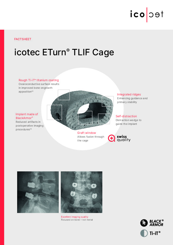The ETurn TLIF Cage by icotec is a titanium coated carbon fiber/PEEK spacer using proprietary titanium coating Ti-iT and BlackArmor Carbon/PEEK material. The coating allows bony ingrowth and cellular adhesion while maintaing the benefits of artifact-free post operative imaging.