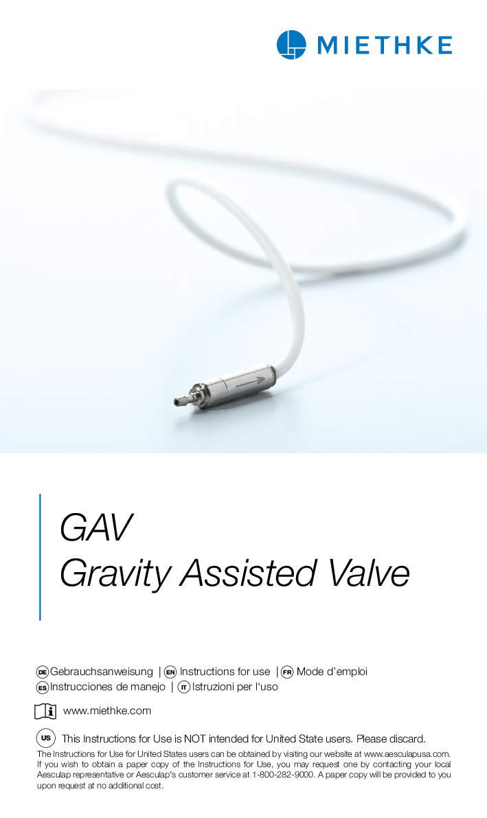 The GAV Gravity Assisted Valve by Miethke (Aesculap) is a position dependent 2-in-1 valve with a spring-loaded ball-in-cone fixed pressure differential valve combined with a gravitational unit that drains at different pressures depending on the vertical to horizontal position. The Gravitational unit is comprised of a weighted tantalum ball that presses down on a sapphire ball to increased the pressure required to open the valve. In the upright position, the closure of the gravitational valve prevents the siphoning effect.