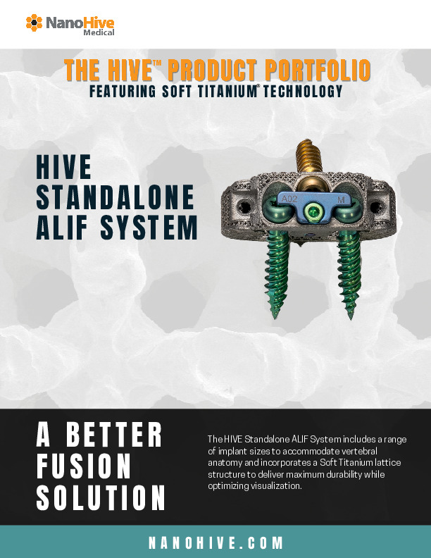The HIVE Stand-alone ALIF system by NanoHive is a novel soft-titanium lattice that incorporates a low density 3D printed titanium architecture design that allows independent movement of the endplates under physiologic loads. This is accomplished via the unique internal architecture that allows some dynamic motion and load distributuion. It also features acid-etched surface treatment to increase bony ingrowth. Injection ports allow flowable graft to be injected into the internal structure of the implant. The implant incorporates 3 hole screw fixation with locking screw plate for zero-profile stand-alone usage.
