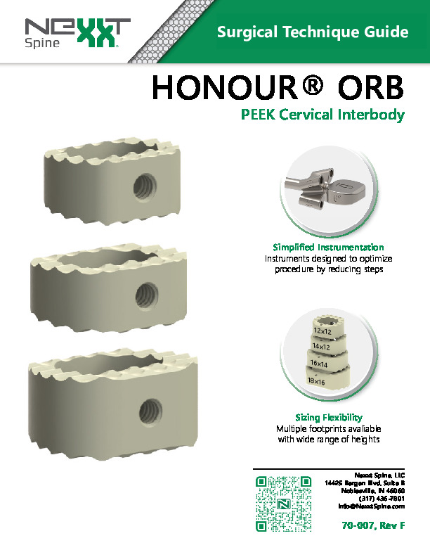 The HONOUR ORB is a PEEK Cervical ACDF interbody Spacer for use in the Anterior cervical discectomy procedure. Requires supplemental fixation