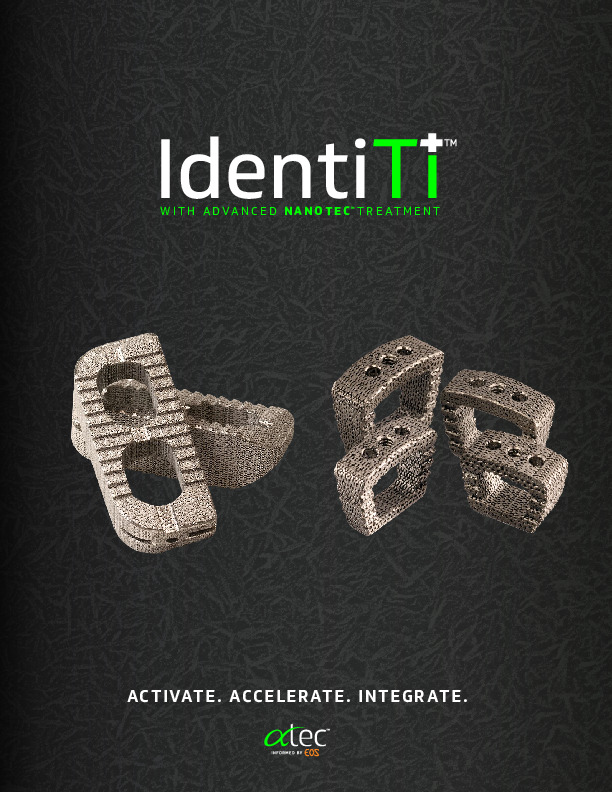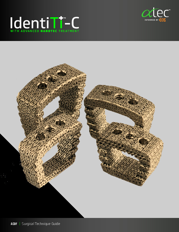 The IdentiTi - C NanoTec ACDF spacer by ATec is a 3D printed titanium spacer which is cage-only with Hydroxyapatite coating (HA). This cage requires supplemental fixation such as a plate. Different from the IdentiTi -C in that this spacer has HA coating applied.