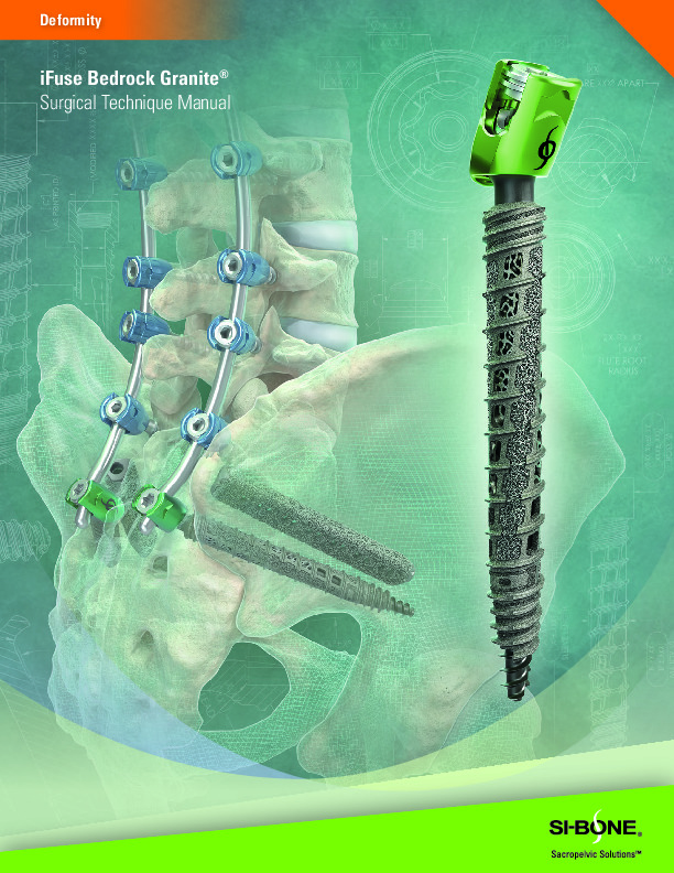 The iFuse Bedrock Granite is a 3D printed titanium microporous lattice outer structure that mimics cancellous bone for increased bony ingrowth. The Screw is intended for sacro-iliac and pelvic fixation as well as increased fusion at the sacrum (S1).