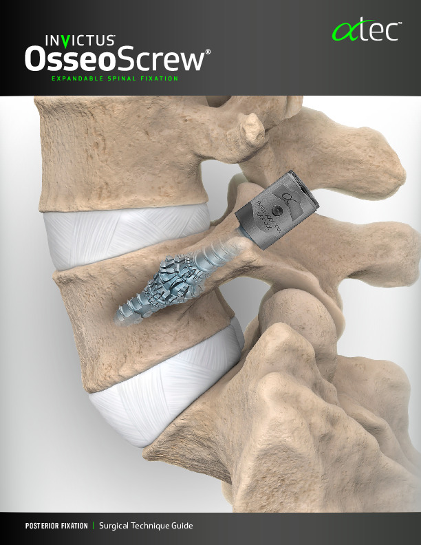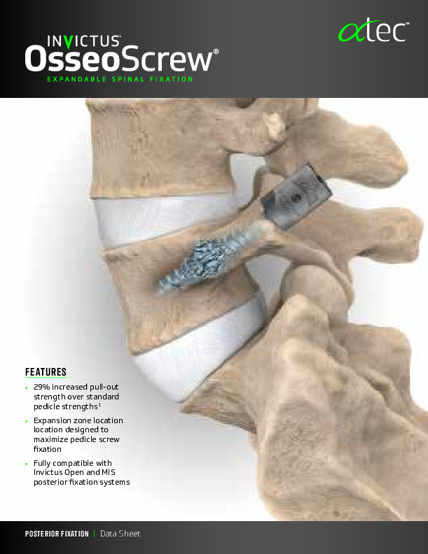 The Invictus OsseoScrew by ATec is a novel approach to combat poor bone quality and increase fixation and improve pull out strength. The OsseoScrew is inserted into the pedicle and cancellous vertebral body and a tool pulls back the tip of the screw similar to a rivet causing expansion at the distal section of the screw to increase screw fenestration and allow bony ingrowth. Improved pull out strength by 29%. Compatible with open and MIS sets.