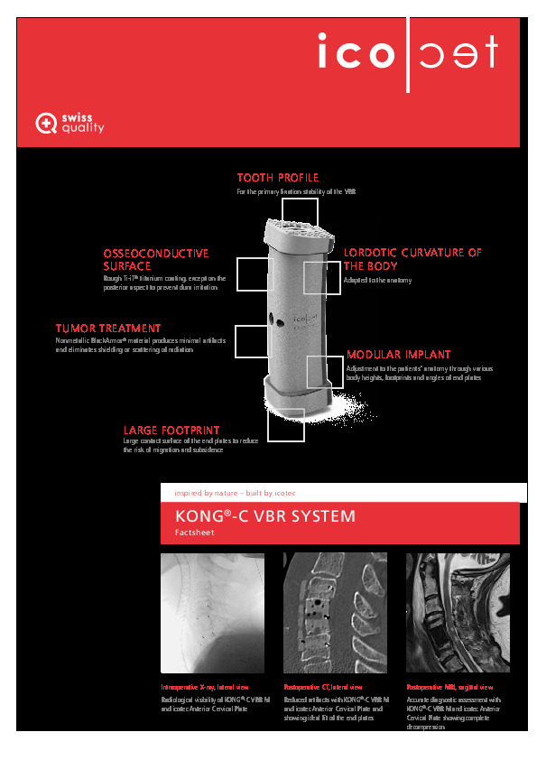 The KONG -C VBR System by icotec Medical is a cervical corpectomy spacer composed of radiolucent titanium coated carbon fiber/PEEK. The Spacer is modular with several sizes and endplate options.