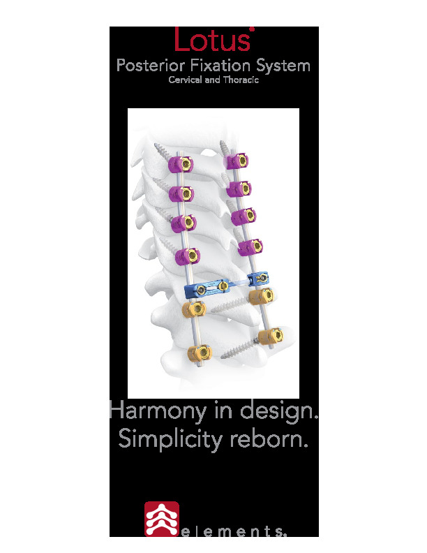 The Lotus Posterior Cervical-Thoracic Fixation system by Spinal Elements is a comprehensive posterior lateral mass and pedicle screw fixation system that features a high favored angle up to 45 degrees and 40 degree in all other angulation. Comes as a complete system with rod connectors, transition rods, offset connectors etc.