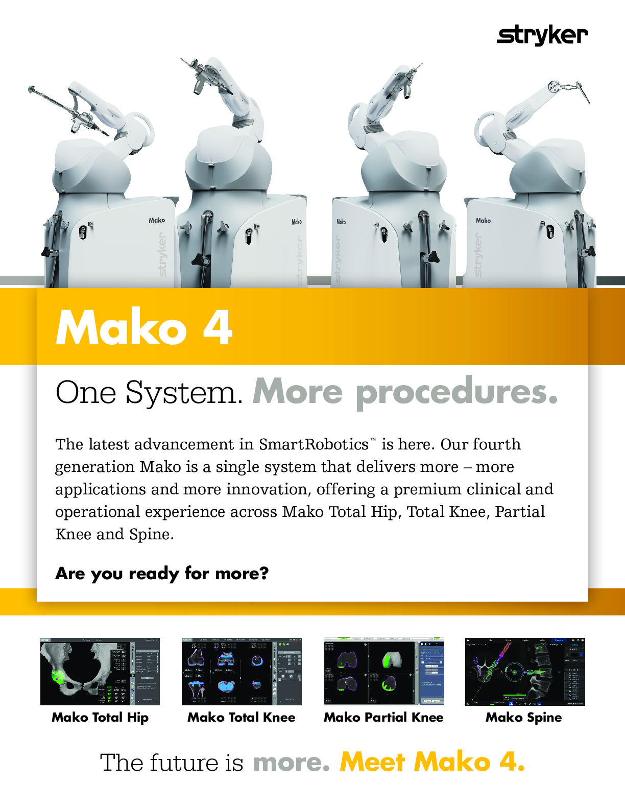 The Mako 4 surgical robotic arm is the newest iteration of the surgical navigated robot that brings with it the integration of Mako Spine. The platform integrates with the Stryker Q Guidance stereotactic navigation system. The automated system provides haptic feedback when drilling and placing screws along with an integrated easy to use surgeon interface for screw planning and navigation. The Mako allows manual movement of the robotic arm to positions that are better for patient-specific workflow.
