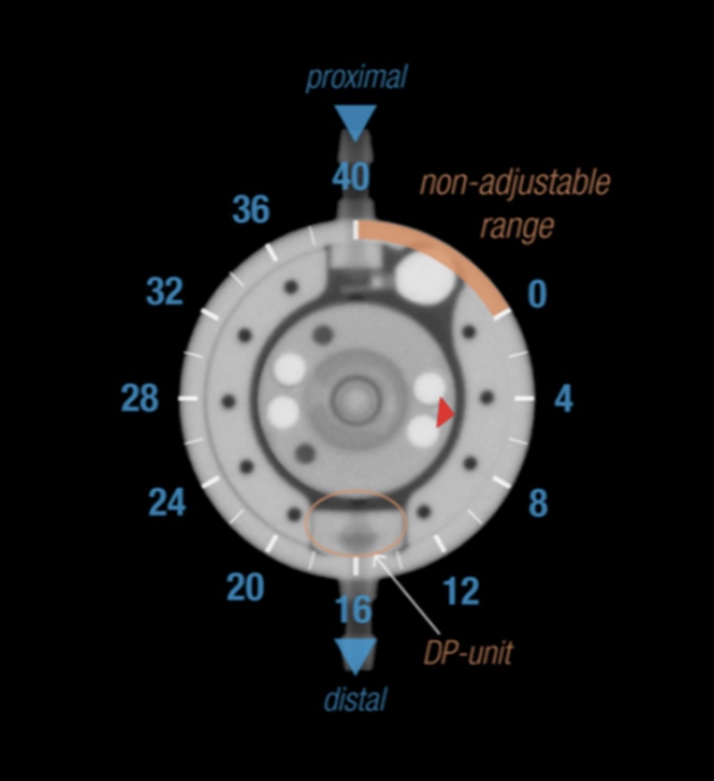 M.Blue Plus version of the valve configuration is a combination of the proGAV adjustable differential pressure valve and the M.Blue gravitational valve with a 0 cmH2O differential pressure unit.