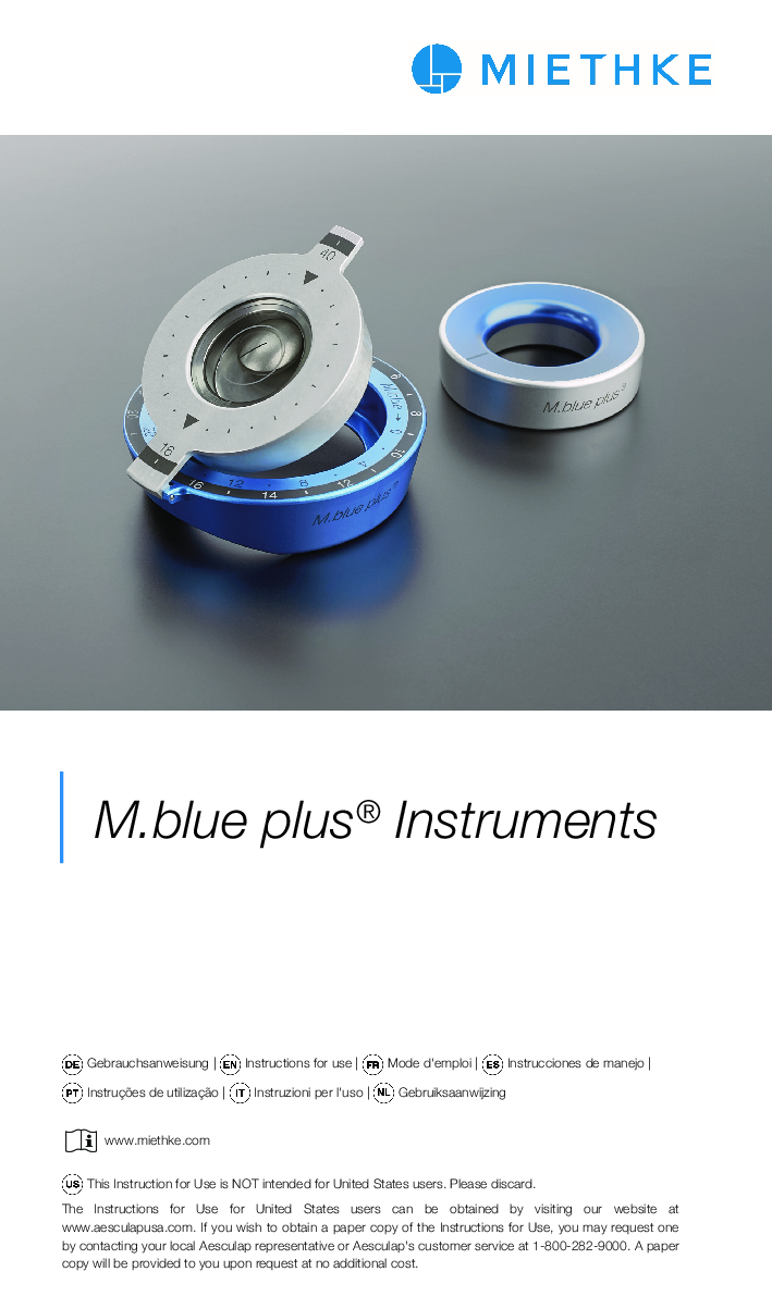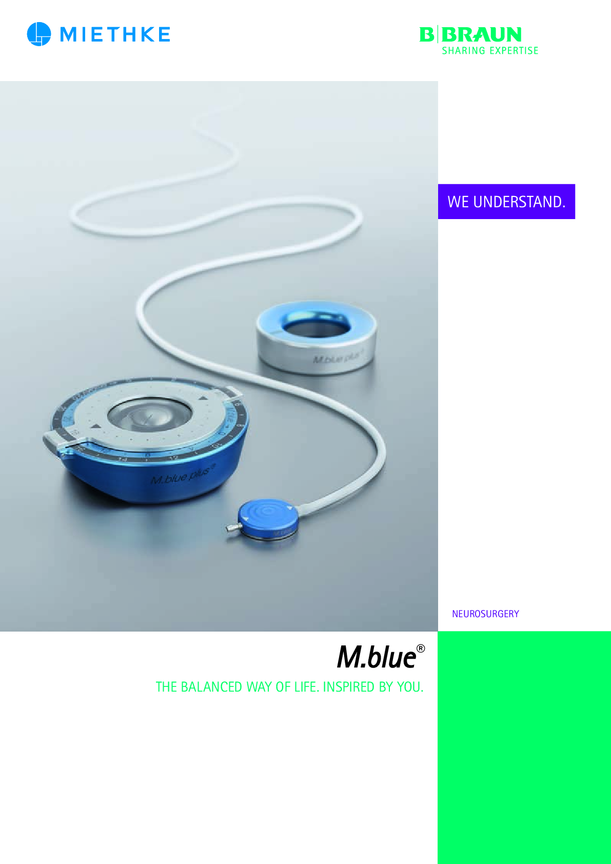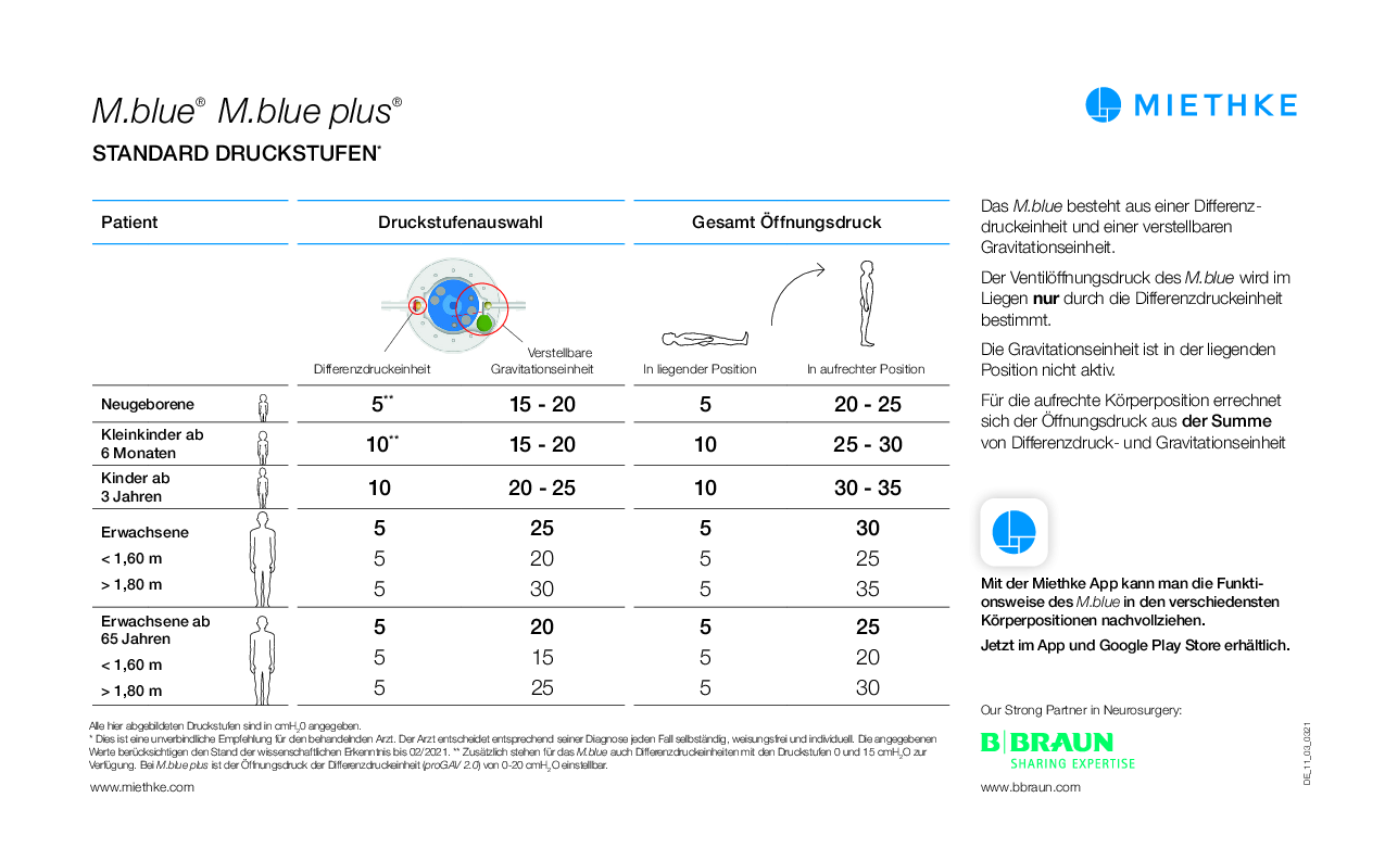 The M.Blue and M.Blue Plus Miethke Hydrocephalus shunt valves distributed by Aesculap are 2 configurations of the adjustable Gravitational valve. The M.Blue is the adjustable gravitational valve combined with a fixed differential pressure valve integrated into the base of the unit and is available in 4 pressure options of 0, 5, 10, 15 cmH2O options. The adjustable gravitational anti-siphon portion of the valve ranges 0-40 cmH2O.