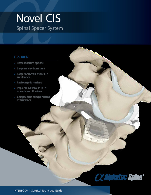 The Novel CIS (Cervical Interbody Spacer) is an Anterior cervical spacer for ACDF procedures. It is available in PEEK and titanium and is the cage alone requiring supplemental fixation.