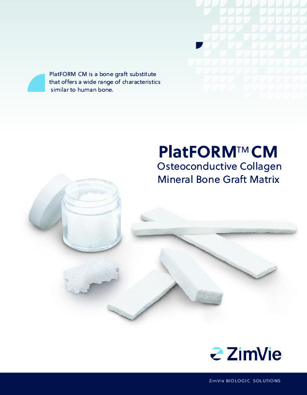 The PlatFORM CM (collagen matrix) is a dehydrated synthetic strip of Calcium Apatite (similar to Beta-Tricalcium phosphate and hydroxyapatite) along with type 1 collagen from bovine source. Can be hydrated with BMA, blood, or saline