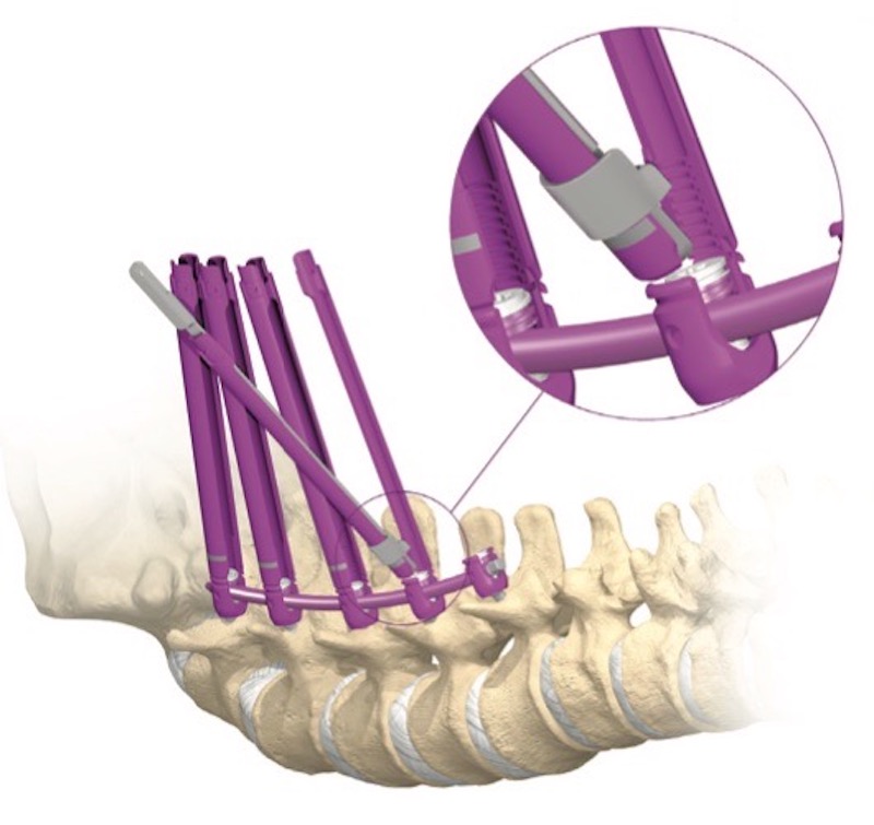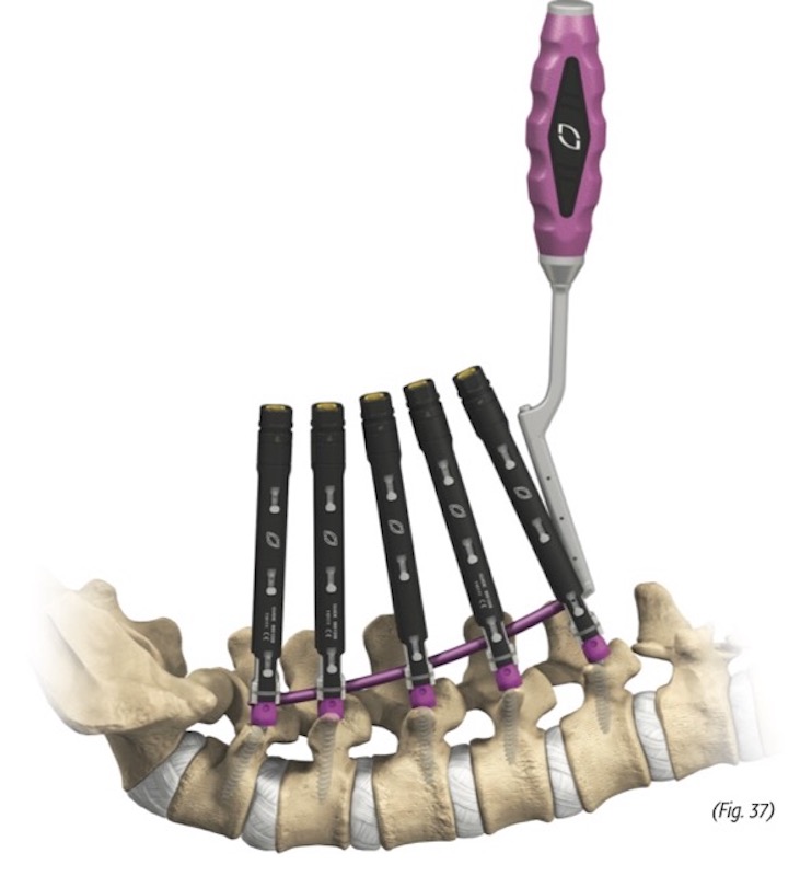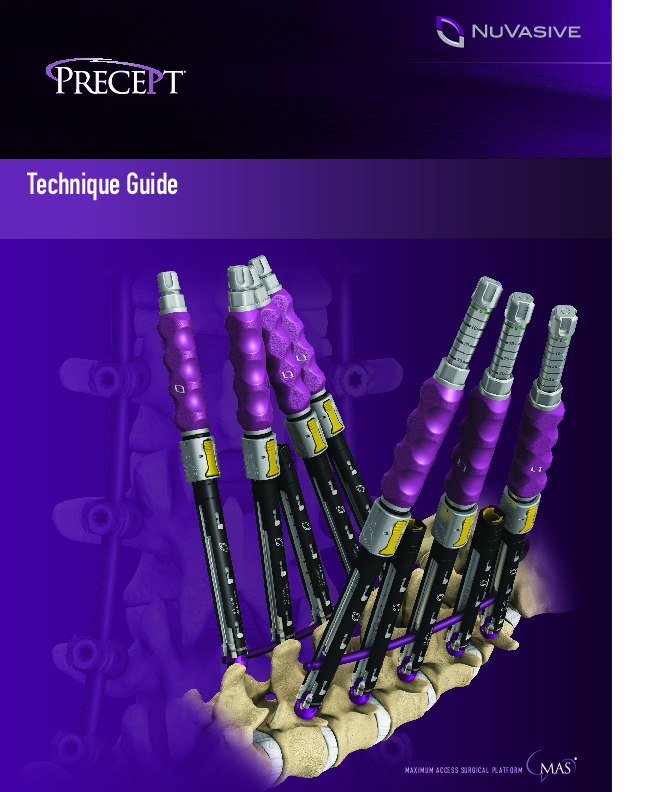 Precept by Nuvasive (now Globus) is an MIS posterior pedicle screw fixation system designed for ease-of-use while providing tissue-sparing technology in the thoracic and lumbar-pelvic spine. Tissue-sparing instrumentation includes K-wire compatible tools and cannulated screws, dilators, and either pedicle screw guides for use with polyaxial screws or modular screw shanks with tulips, or reduction screws that have removable extended tabs.