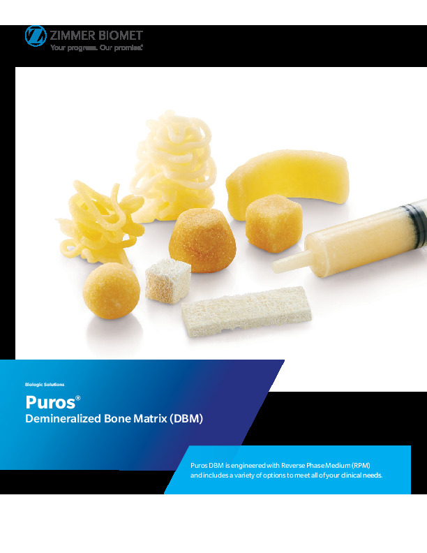 The Puros DBM Demineralized Bone Matrix by Highridge Medical (previously marketed under Zimmer-Biomet which spun off its spine products to ZimVie in 2024) is a family of products that provide osteoconductive and osteoinductive properties.