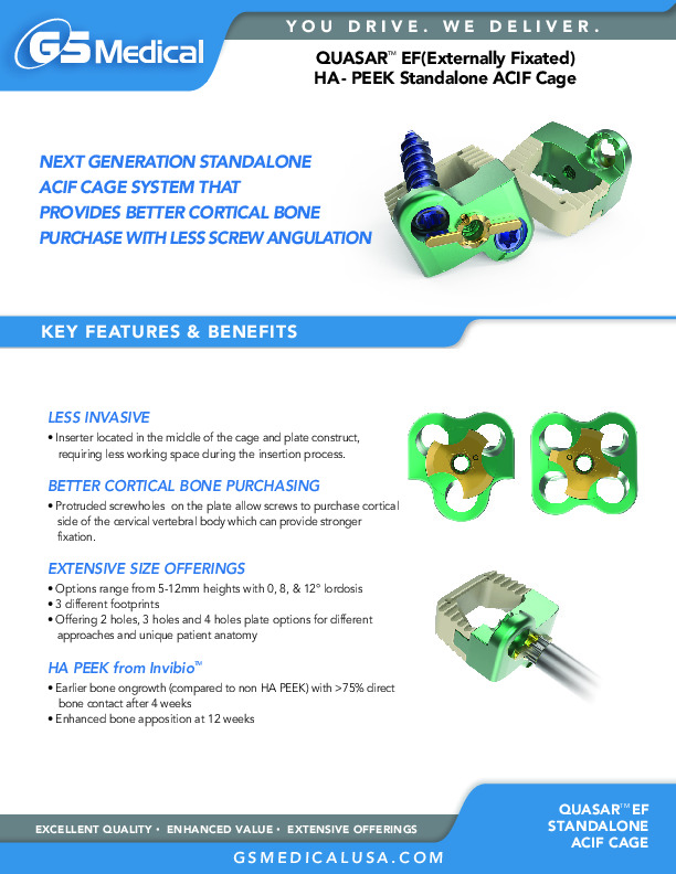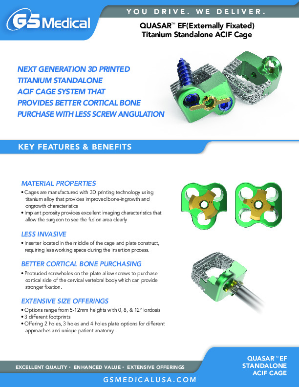 The Quasar 3D Ti Stand Alone ACIF spacer by GS Medical is a stand-alone ACDF plate and spacer modular unit that is available in 2 material options: 3D printed porous titanium and HA(Hydroxyapatite)-integrated PEEK. The ACDF spacer is an integrated zero-profile plate that assembles to the spacer for an integrated stand-alone ACDF procedure. Plate options include a 2, 3, and 4 hole minimal profile and zero-profile.