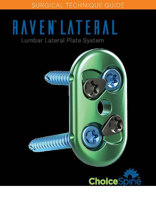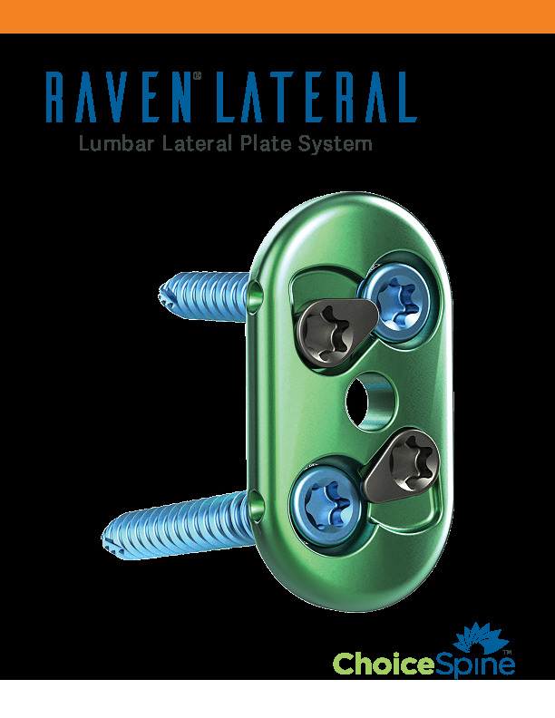 The RAVEN L Lateral Lumbar Plating System by Choice Spine is a two screw locking plate designed for use in the direct lateral retroperitoneal approach. it has a a locking cam to prevent screw backout.
