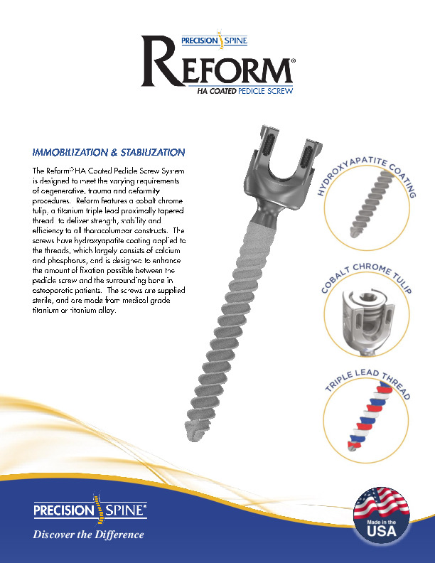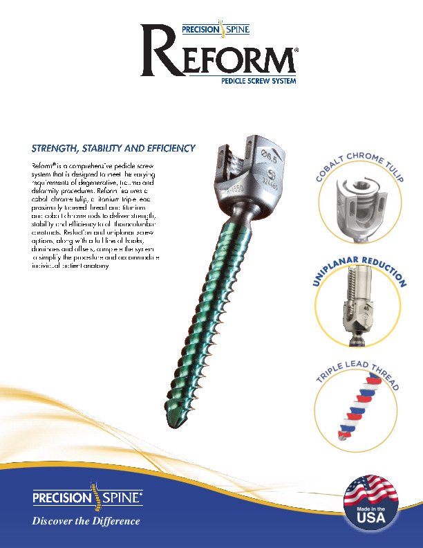 The Reform Thoracolumbar Pedicle Screw System by Precision Spine is a comprehensive system that featrues: Cobalt Chrome CoCr heads, a T20 hexalope screw post drive and comes in multiple screw options including modular head, HA coated screws, reduction heads, fixed heads