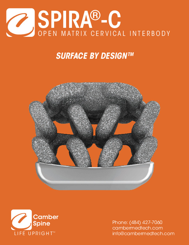 The SPIRA-C Open Matrix Cervical Interbody Spacer by Camber Spine is a 3D printed Titanium space with SPIRA Technology and surface micro texturing for increased bony on-growth. Requires supplemental fixation