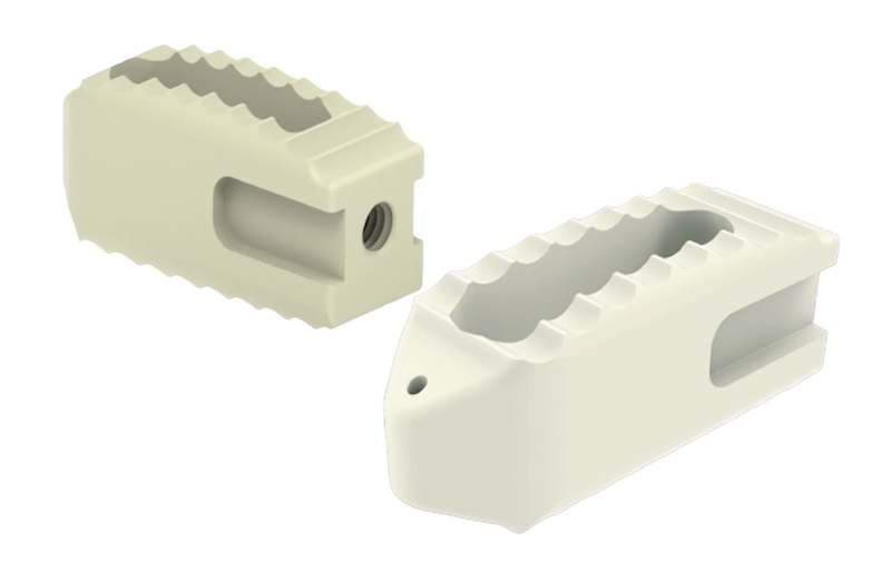 The SPIRA-P 3D printed titanium PLIF spacer with surface texturing by Camber Spine is an open architecture spacer for use bilaterally in the PLIF procedure. A bullet nose improves insertion