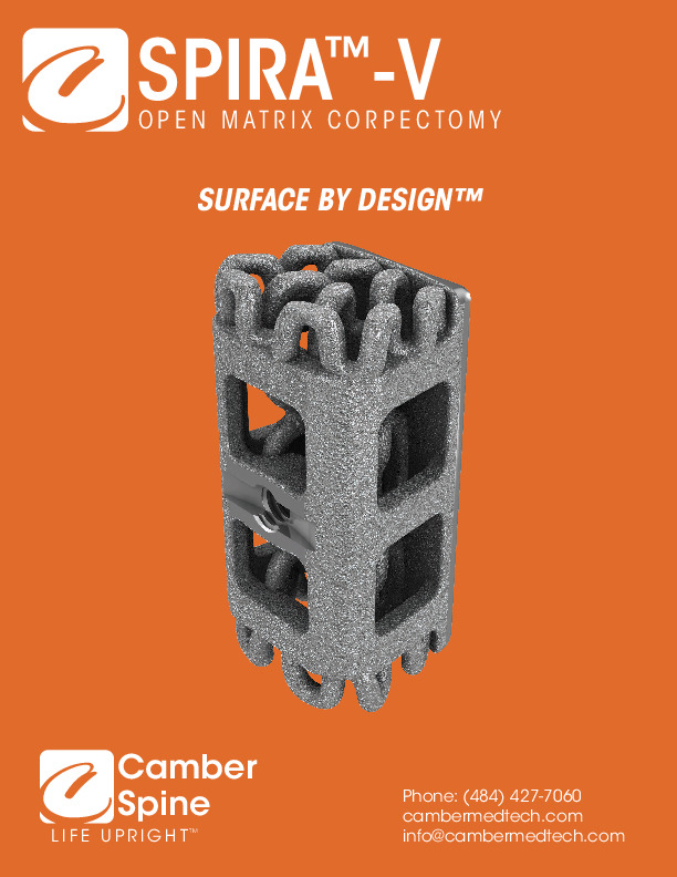 The SPIRA-V is a 3D printed titanium corpectomy spacer by Camber Spine. The cage features an open architecture spacer with large graft windows and surface texturing.