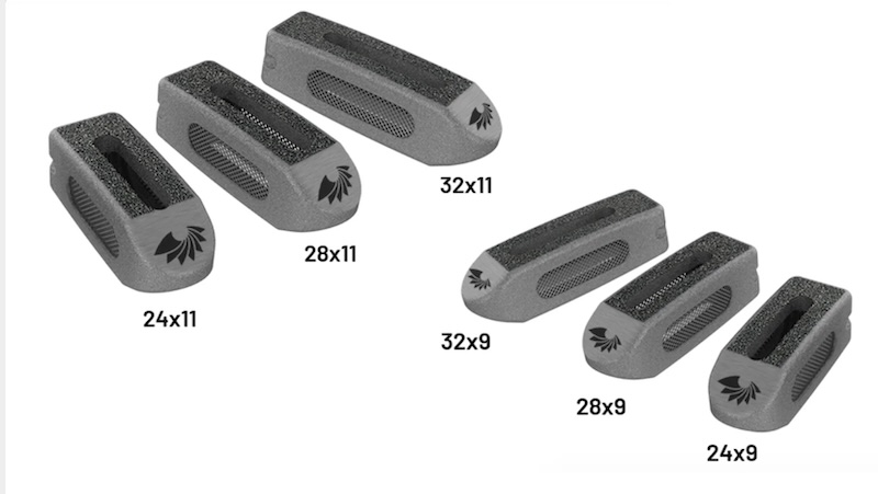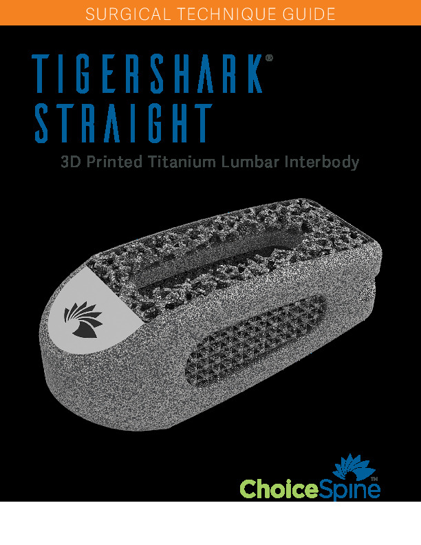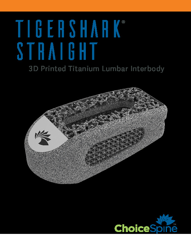 The TIGERSHARK Straight 3D Printed Titanium Lumbar Interbody Spacer by Choice Spine produced using proprietary BioBond porous trabecular titanium structure that allows bony ingrowth. It features a tapered nose and is intended for implant as an oblique single spacer or bilateral PLIF spacers.