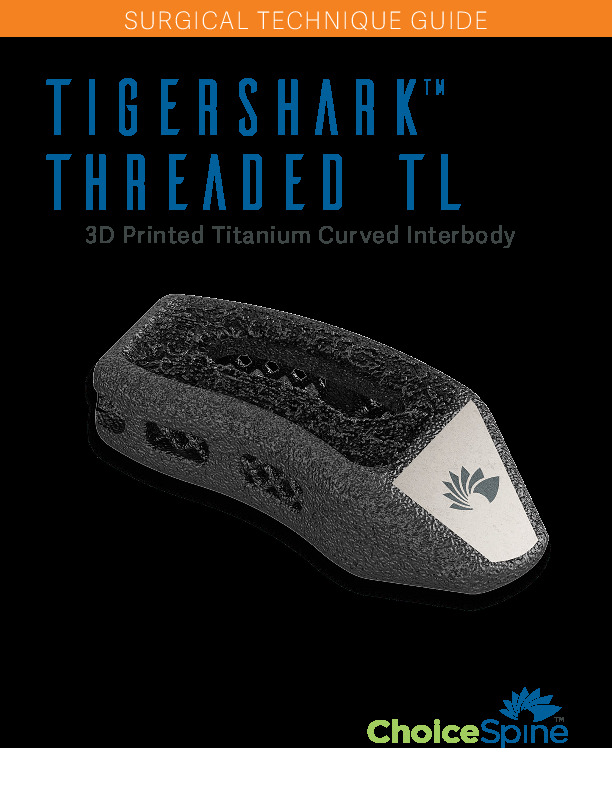 The TIGERSHARK Threaded TL is a 3D printed porous titanium curved interbody spacer for use in the TLIF procedure. It features BioBond technology producing porous trabecular titanium structure which allows for bony ingrowth. It features a tapered nose for easy insertion.