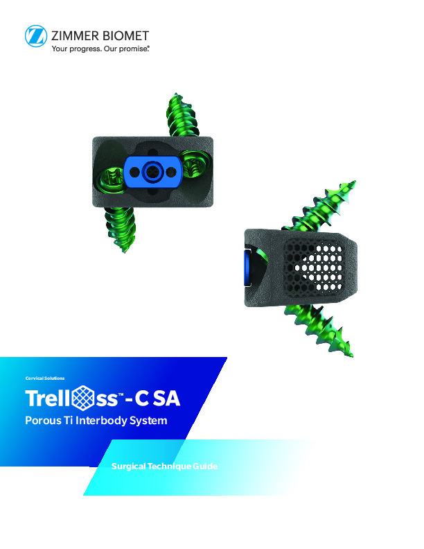 The TrellOss -C SA is a standalone ACDF spacer with integrated screw fixation originally sold by Zimmer-Biomet now owned by Highridge Medical. It features a 3D printed open architecture with 70% porosity and a large graft window. Locking screw mechanism with a twist lock to prevent screw migration.