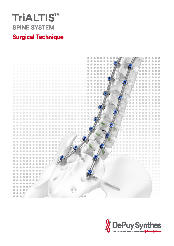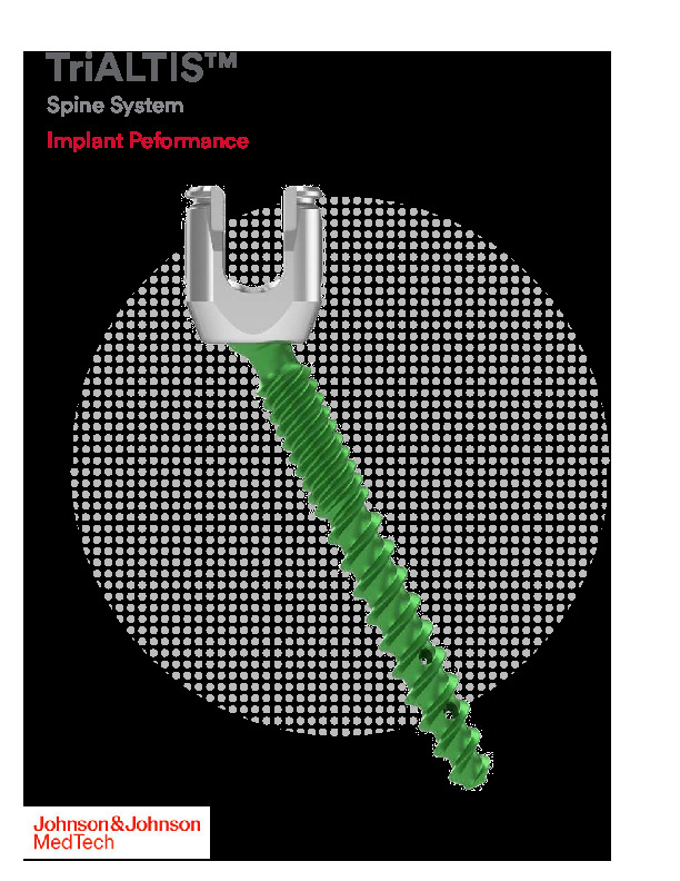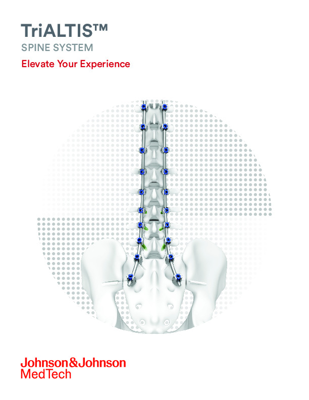 The TriALTIS Spine System by J&J MedTech (DePuy-Synthes) is a next generation thoracolumbar pedicle screw system built on the experiences of EXPEDIUM 5.5, VIPER, and MATRIX. TriALTIS features a 5.5mm or 6.0mm rod system and a T27 hexalope screwdriver for both the pedicle screw and the set cap. The system features open and MIS percutaneous screws and features a dual thread pitch cortico-cancellous thread.