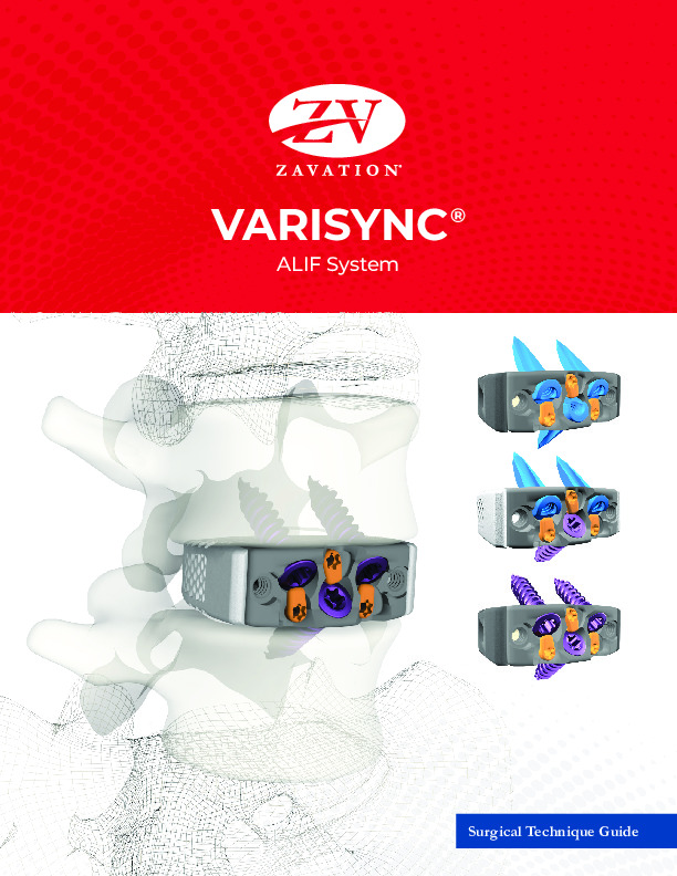 The Varisync ALIF System by Zavation is a stand alone Anterior lumbar interbody spacer designed with a modular plate and spacer. The fixation is achieved through either use of traditional screw fixation or anchor fixation. The spacers are available as the F3D-Z 3D printed titanium or NanoPrime titanium coated PEEK. The Plate and cage slide together pre-insertion.