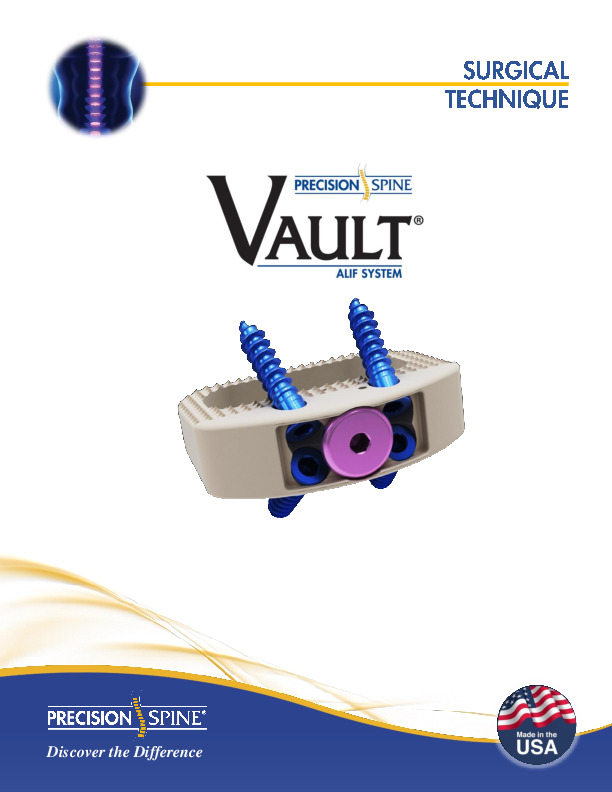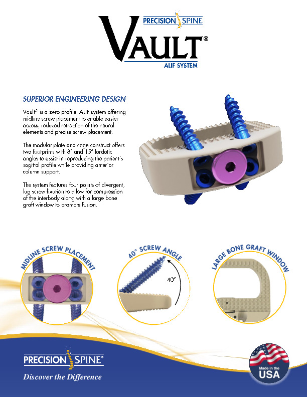 The VAULT Zero-profile PEEK ALIF Spacer by Precision Spine is a modular PEEK spacer and PEEK anterior plate construct that offers true stand alone fixation with integrated screws. The modular nature of the spacer allows attachment of the plate to the spacer and a locking screw cap to prevent backout.