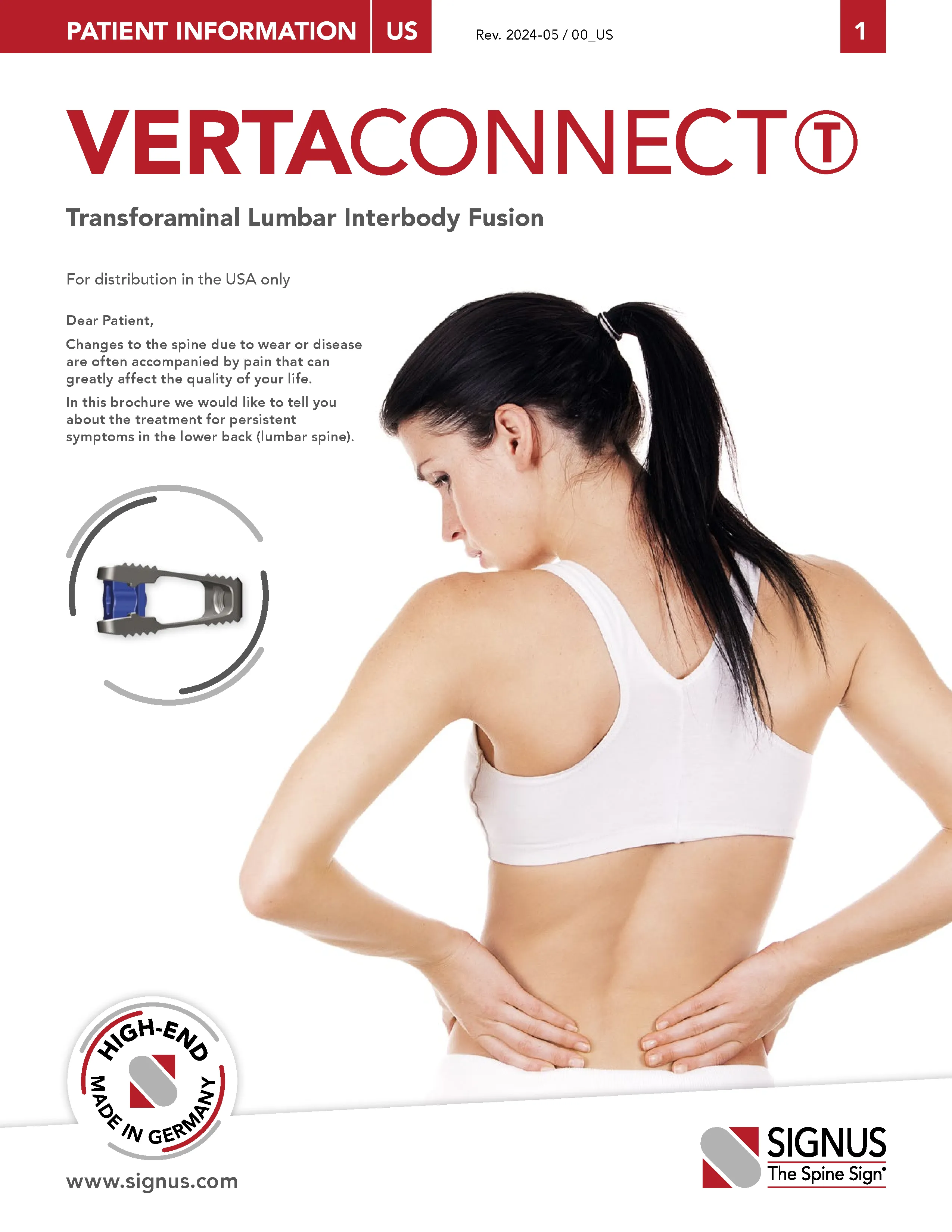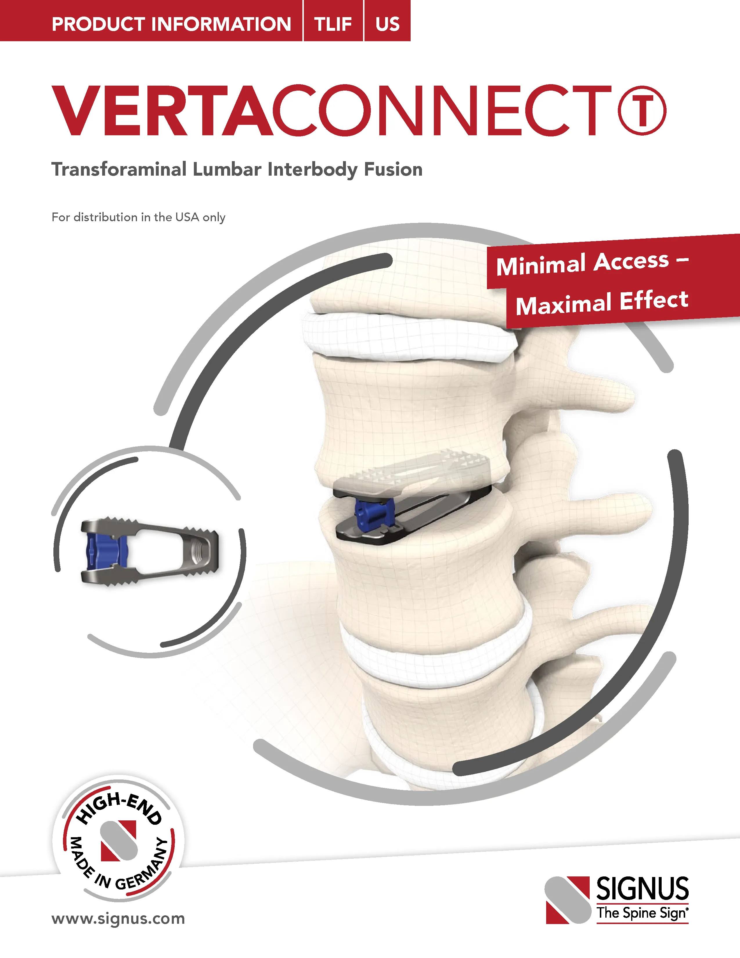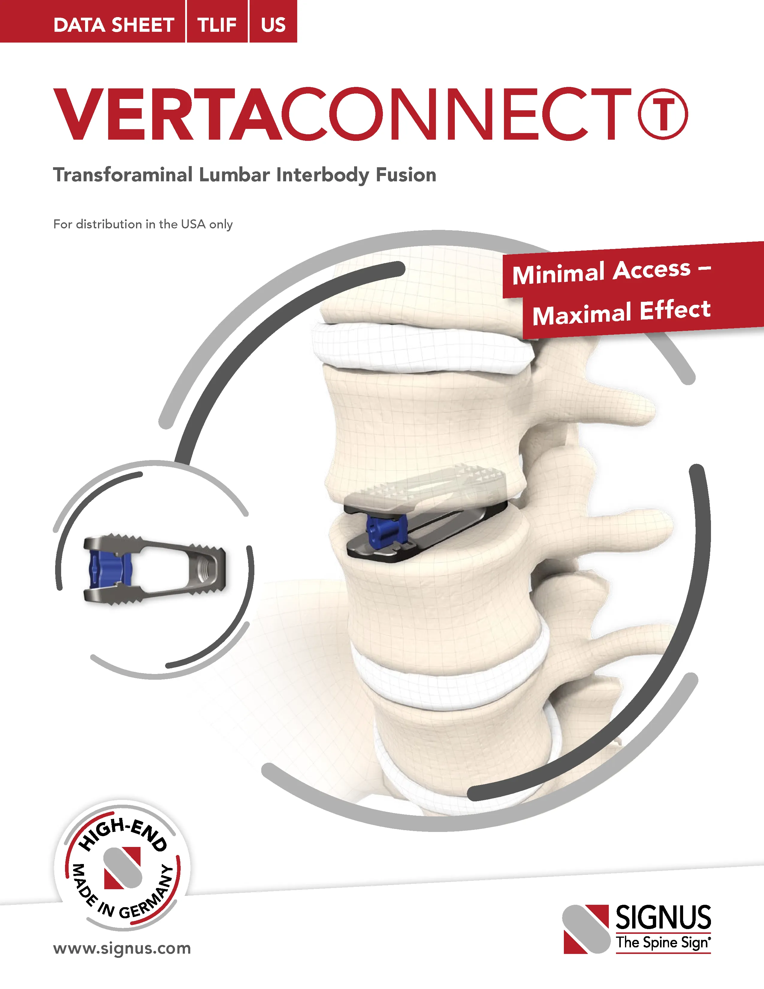The VERTACONNECT transforaminal lumbar interbody implant by Signus is an expandable titanium spacer designed for oblique placement within the disc space, and can be inserted via open or minimally invasive approach. It features diagonal implant placement for easy and rapid implantation, open cage design for optimal bone graft filling and osseointegration, low entry height with in situ expansion, biconvex shape and lordotic angulation, large contact area to reduce subsidence, and a toothed surface to prevent migration. Requires additional posterior stabilization.