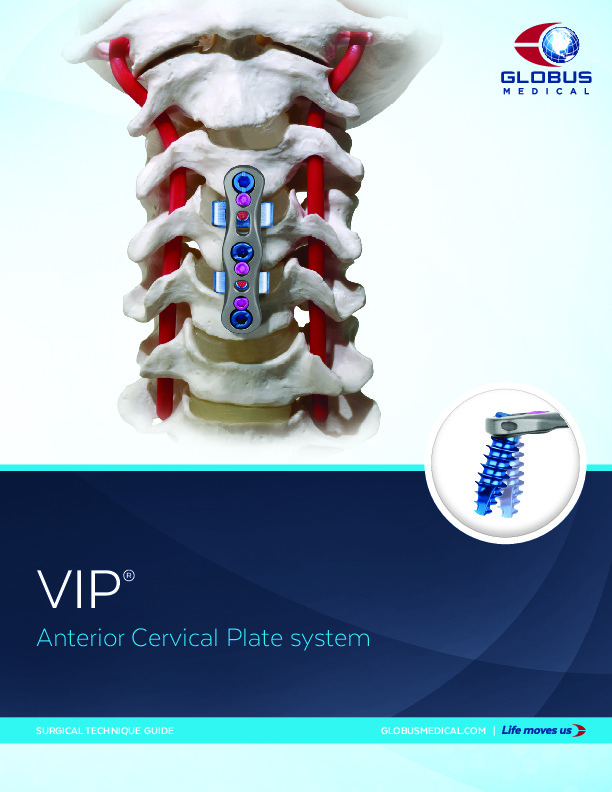 The VIP (Vertical In-Line-Plate) by Globus Medical is a minimally invasive single-screw-per-level anterior cervical plate that is available in 1 and 2 level plates only.