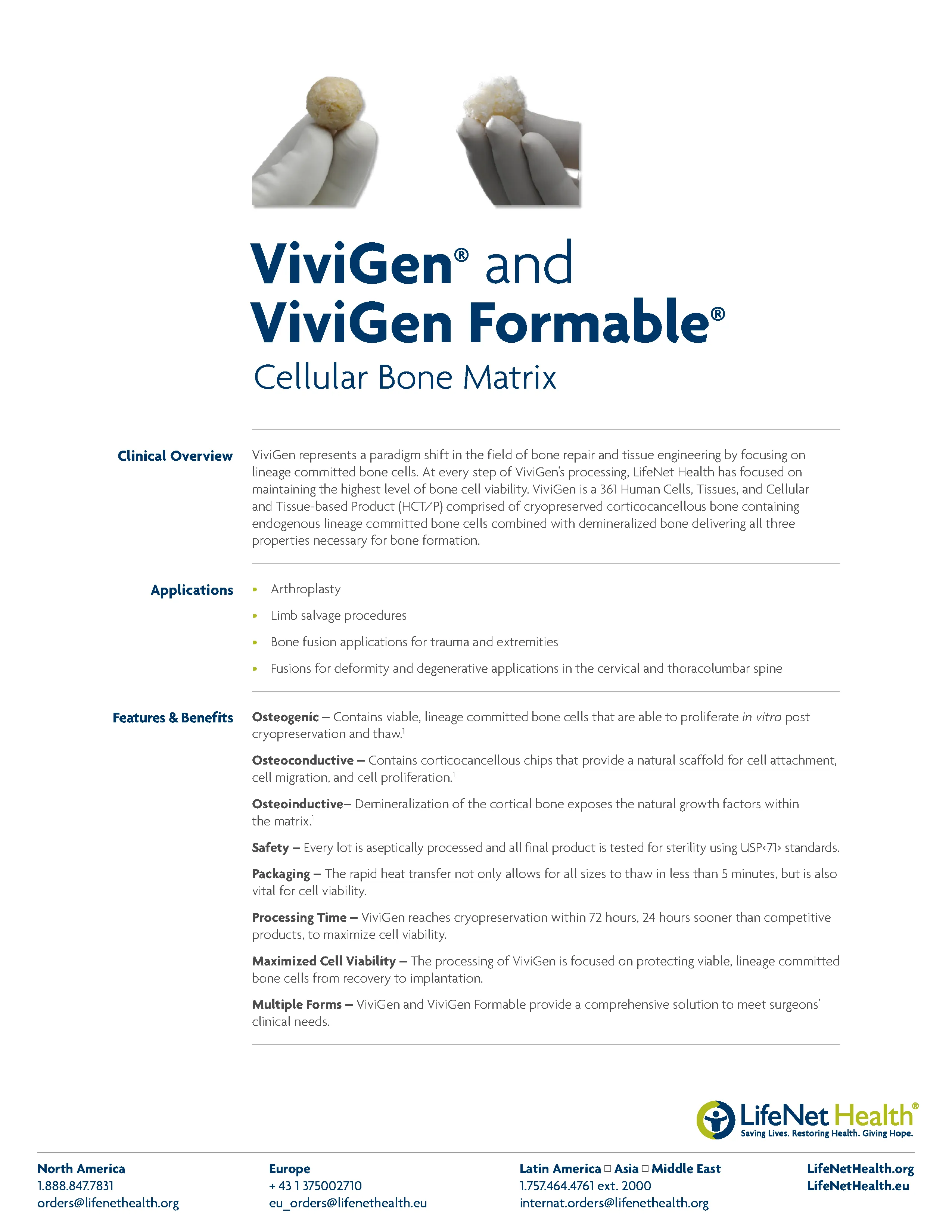 Vivigen and Vivigen Formable by J&J MedTech (Formerly Depuy-Synthes) is a cellular bone matrix allograft biologic prodhe uced by LifeNet Health and ditstributed under J&J MedTech. Vivgen and Vivigen Formable are composed of demineralized cortical/cancellous bone with viable cells cryopreserved and guarenteed to have 96% of viable cells post-thaw.