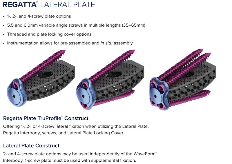 The WaveForm L is a 3D printed titanium lateral lumbar interbody spacer for use in the XLIF/DLIF/LLIF procedure. It can be mounted with the Regatta lateral lumbar plate for further fixation and stand-alone.