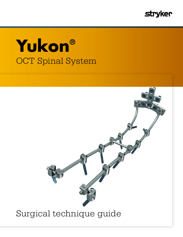 The Yukon OCT by K2M Styker is part of the larger Occipital-Cervical-thoracic fusion system for posterior stabilization. The plate has multiple tabs to be conformed to the occipital anatomy. Features up to 7 points of screw fixation