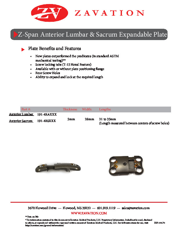 The Z-Span static and expandable plating system by Zavation is a comprehensive set of plates that is both anterior lumbar and lateral thoracolumbar plating and features both static and expandable as well as single and multiple level for corpectomy.
