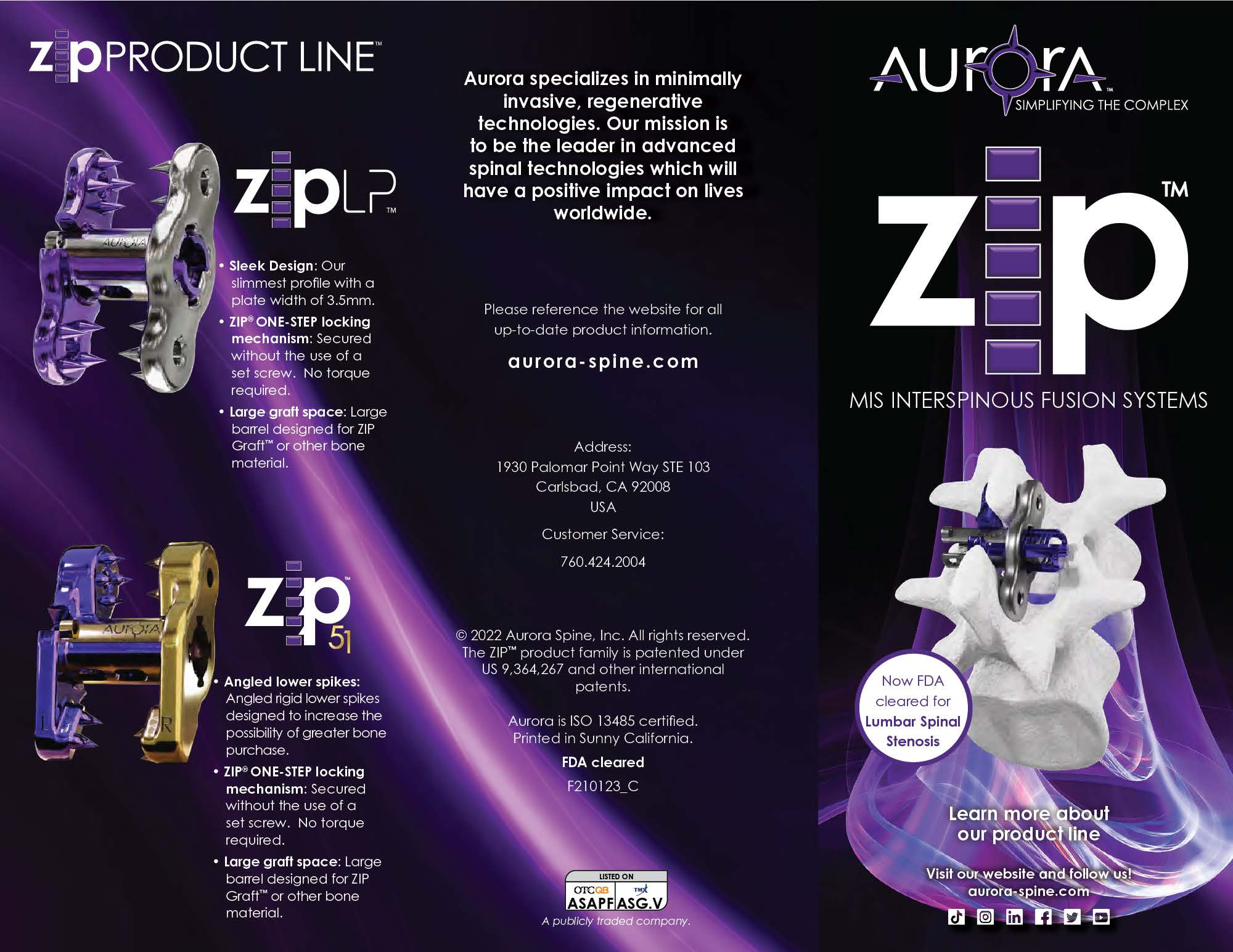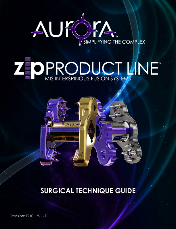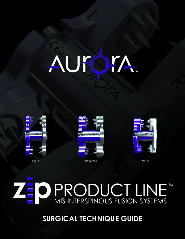 The ZIP (ULTRA, LP, and 51) line of implants by Aurora Spine are minimally invasive interspinous implants for posterior fixation of the thoracic and lumbar spine. They have a one step screwless locking mechanism. The barrell of the implant houses a graft window of grafting fusion material.